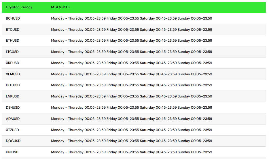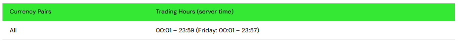 Currency Pairs: 00:01 to 23:59 server time daily (closes 23:57 on Friday)