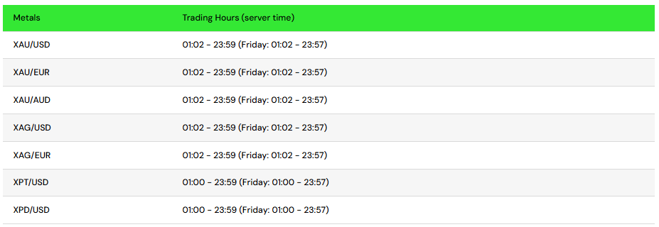 Other Metals (XAG, XPD, XPT): 01:00 Monday open to 23:59 daily close (23:57 on Friday)